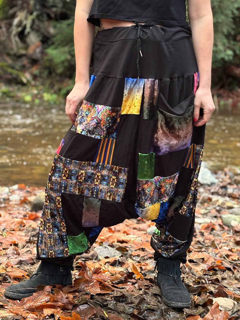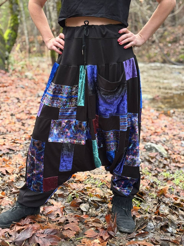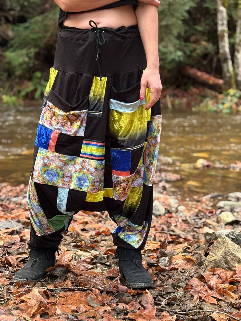 Step into pure magic with our Djinni Pants — ultra-soft bamboo flow paired with lush velvet patchwork, each pair hand-stitched with love by the one and only Miss Frankenstitch. These pants are made for movers, dreamers, dancers, and anyone who wants to feel like a mythical creature drifting through the universe.